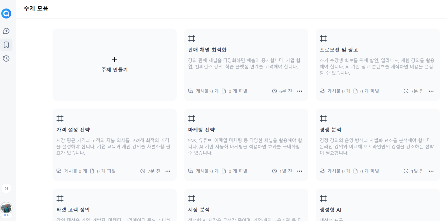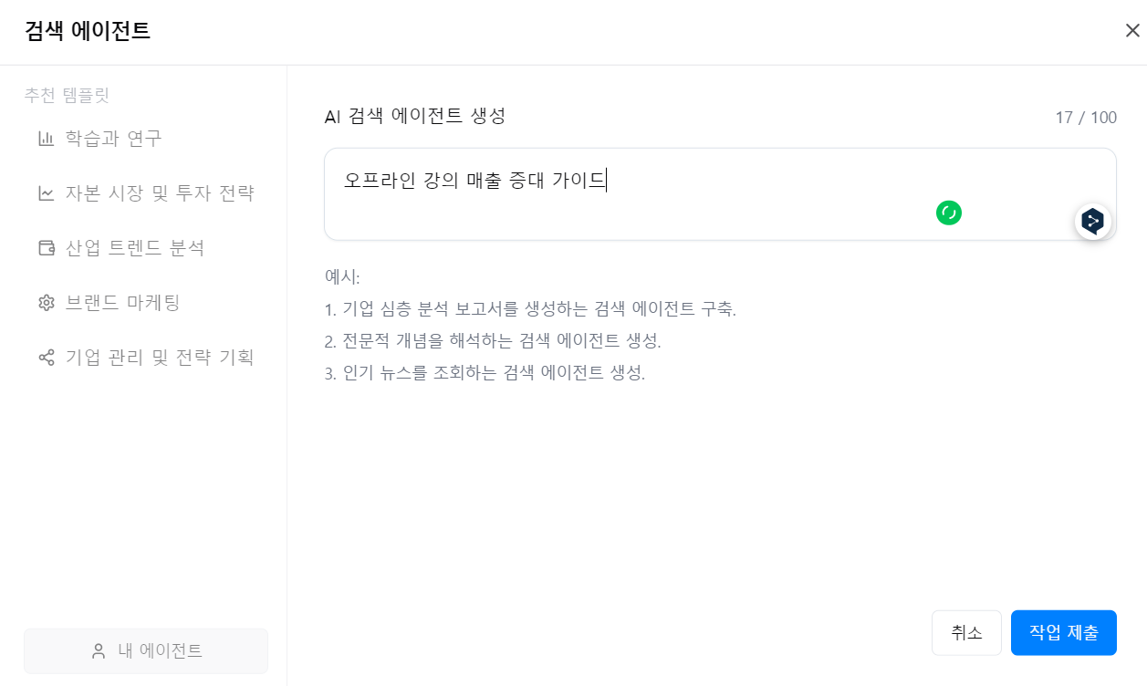 검색 에이전트에 "오프라인 강의 매출 증대 가이드"라는 주제가 만들어집니다.