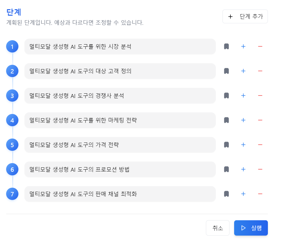에이전트 단계에서는 "시장 분석, 타겟 고객 정의, 경쟁 분석, 마케팅 전략, 가격 설정 전략, 프로모션 및 광고, 판매 채널 최적화" 등을 생성해 줍니다.