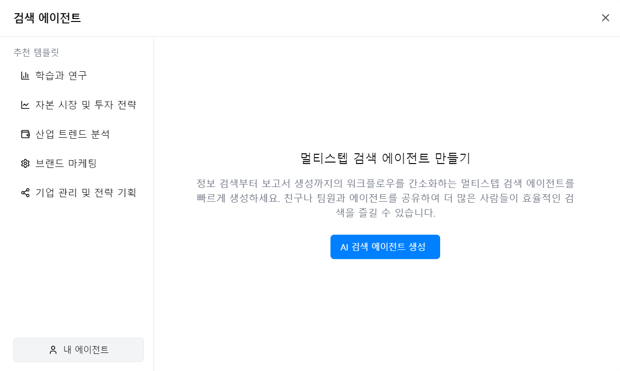 검색 에이전트를 클릭하면 "학습과 연구, 자본 시장 및 투자 전략, 산업 트렌드 분석, 브랜드 마케팅, 기업 관리 및 전략 기획" 등 추천 템플릿이 왼쪽에 보입니다.