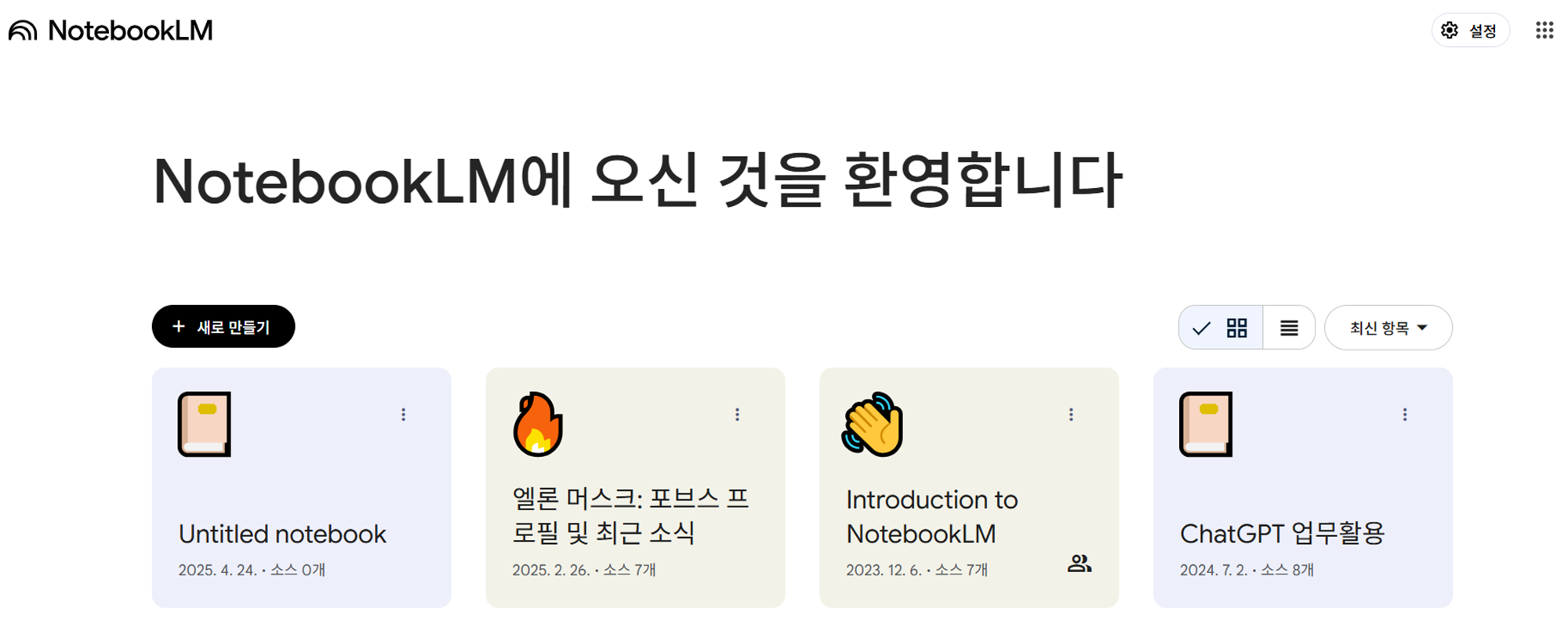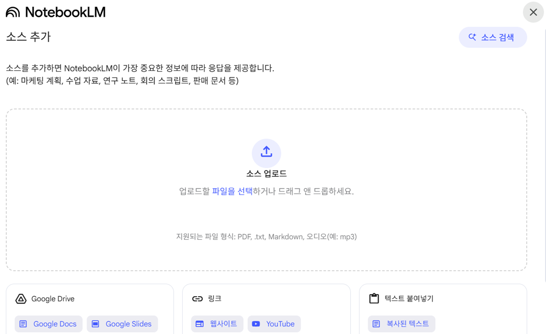- NotebookLM 웹사이트(https://notebooklm.google.com)에 로그인 후 새 노트북 생성