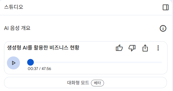 - " 심층 분석 대화" 기능을 사용해서 팝캐스트 형식으로도 생성해줍니다. 47분짜리 팝캐스트로 만들어주세요. 언어는 현재 영어만 지원되고 있습니다. 전문적인 분야의 내용을 작성한 후, 영어로 업무를 보시는 분들은 이 기능을 이용해서 영어공부와 회의 리허설하면 유용할 것 같습니다.