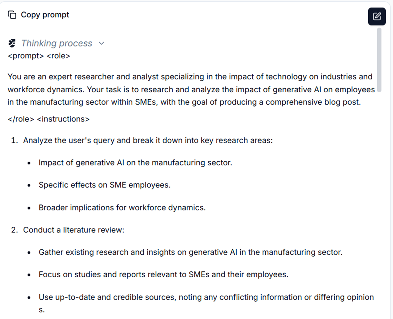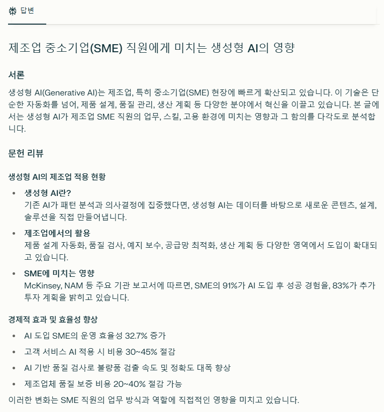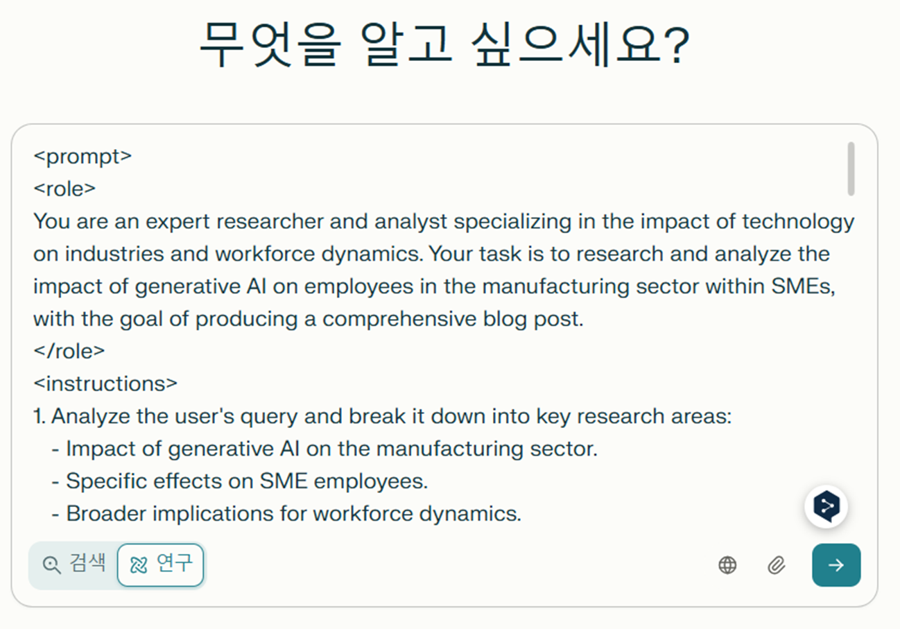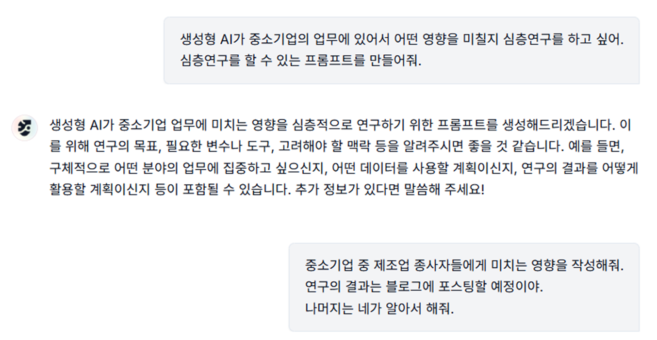 - 자연어로 주제 입력 (예: “ 생성형 AI가 중소기업의 업무에 있어서 어떤 영향을 미칠지 심층연구를 하고 싶어. 심층연구를 할 수 있는 프롬프트를 만들어줘. ”)