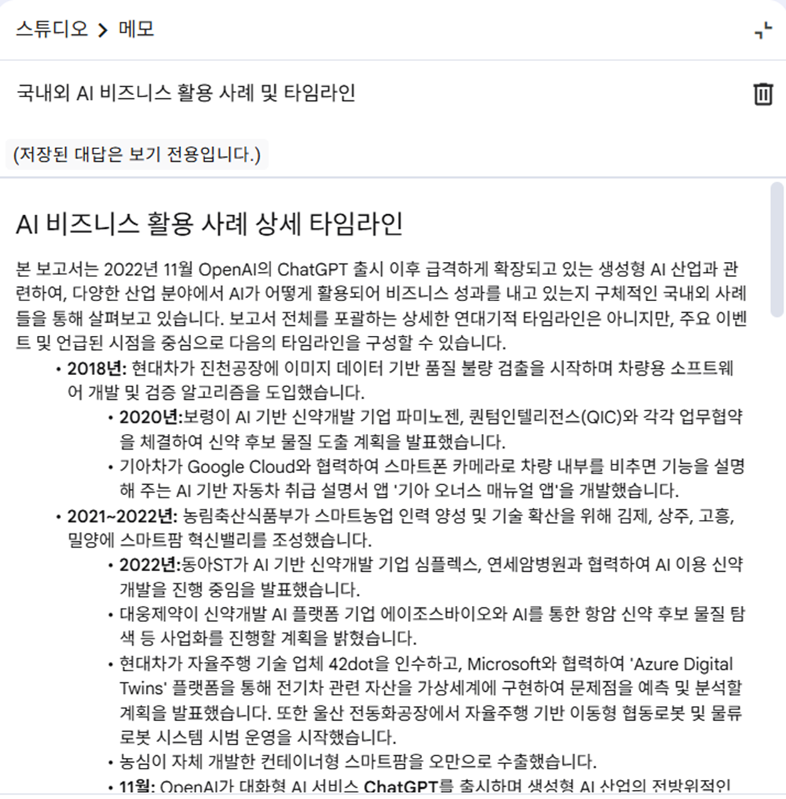 - 생성된 리서치 결과 확인 및 복사